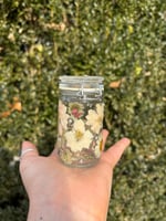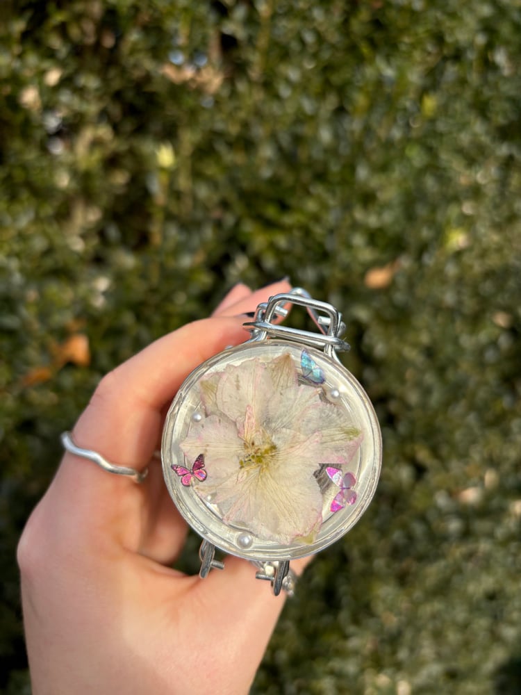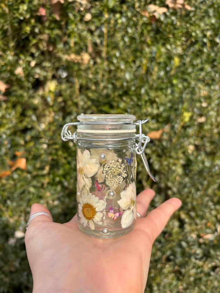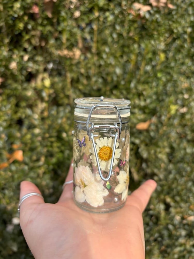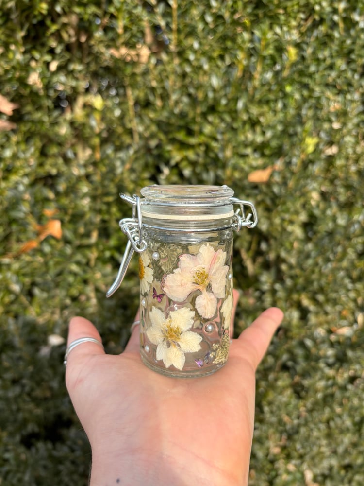 At about 3 floz., this glass jar with latch life has been customized using dried white and very light pink flowers, faux pearl charms and shiny small butterfly decals. All have been encapsulated using UV resistant epoxy resin.